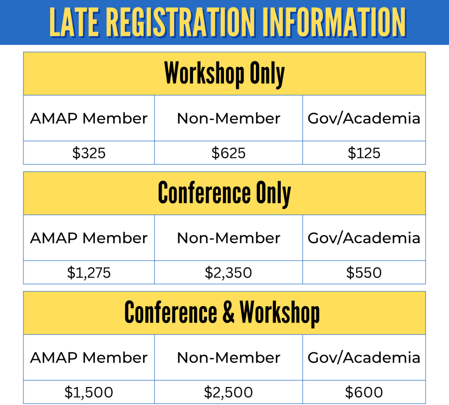 Notification must be received by the AMAP offices if you have registered for the meeting and subsequently find you will be unable to attend. If registration cancellation is necessary, AMAP will refund registration fees in accordance with the following schedule: