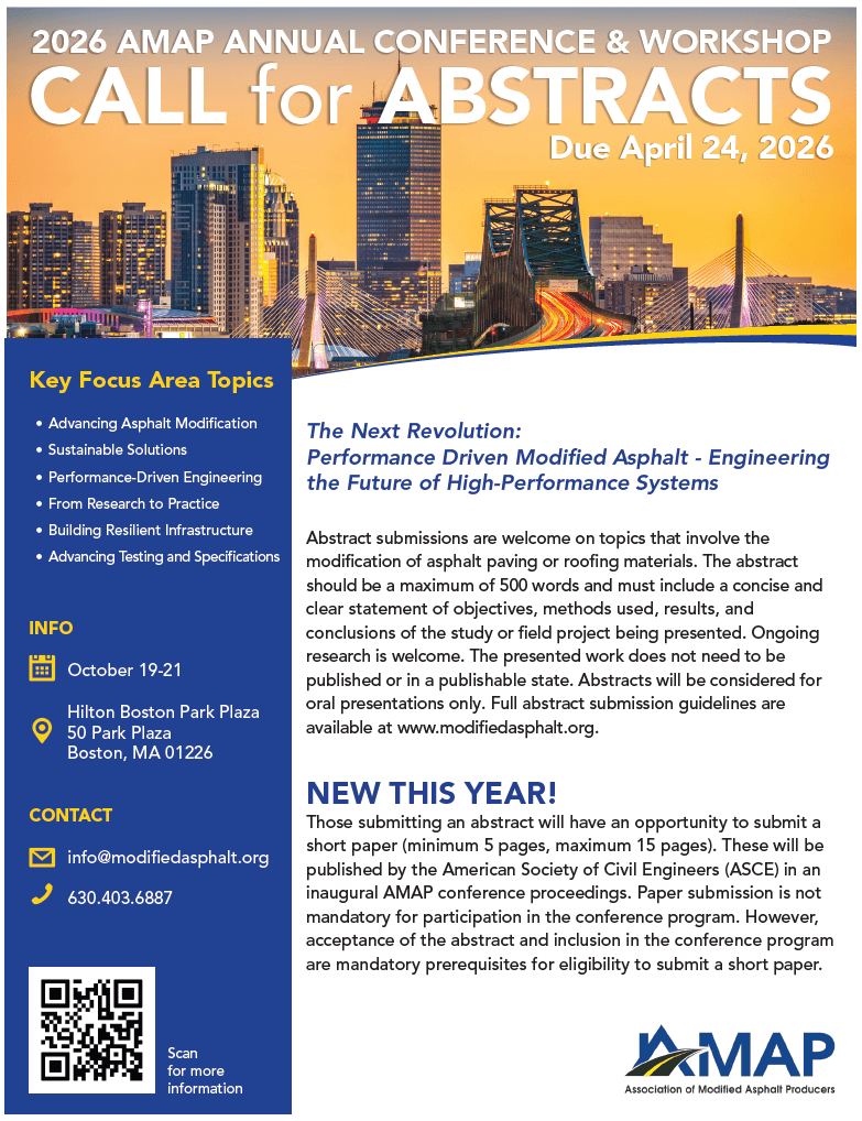 This conference will explore how advanced materials, polymer technologies, and performance-driven engineering are redefining the way we design, produce, and construct asphalt pavements and roofing systems. Through expert discussions, cutting-edge research, and industry collaboration, participants will examine how modified asphalt continues to strengthen pavement performance, improve sustainability, and enhance durability in both transportation infrastructure and roofing applications.